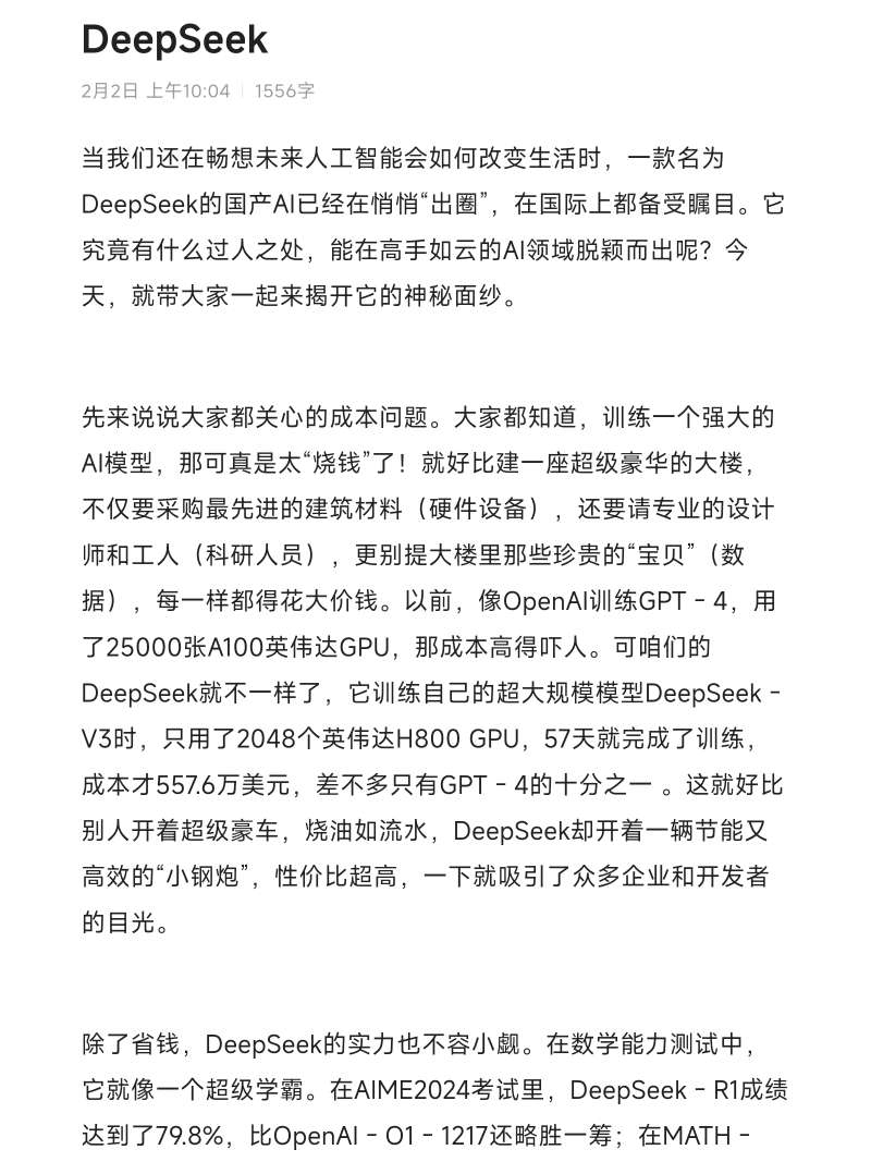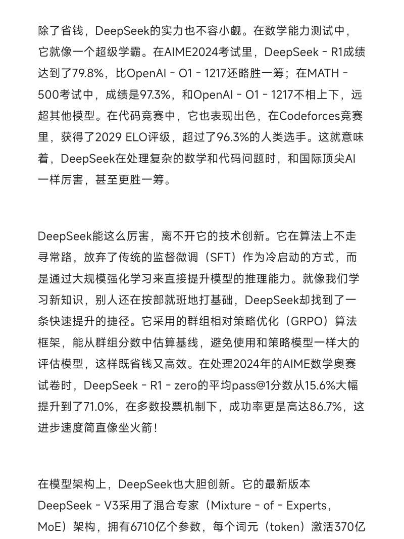 先来说说大家都关心的成本问题。大家都知道,训练一个强大的AI模型,那可真是太“烧钱”了!就好比建一座超级豪华的大楼,不仅要采购最先进的建筑材料(硬件设备),还要请专业的设计师和工人(科研人员),更别提大楼里那些珍贵的“宝贝”(数据),每一样都得花大价钱。以前,像OpenAI训练GPT - 4,用了25000张A100英伟达GPU,那成本高得吓人。可咱们的DeepSeek就不一样了,它训练自己的超大规模模型DeepSeek - V3时,只用了2048个英伟达H800 GPU,57天就完成了训练,成本才557.6万美元,差不多只有GPT - 4的十分之一 。这就好比别人开着超级豪车,烧油如流水,DeepSeek却开着一辆节能又高效的“小钢炮”,性价比超高,一下就吸引了众多企业和开发者的目光。