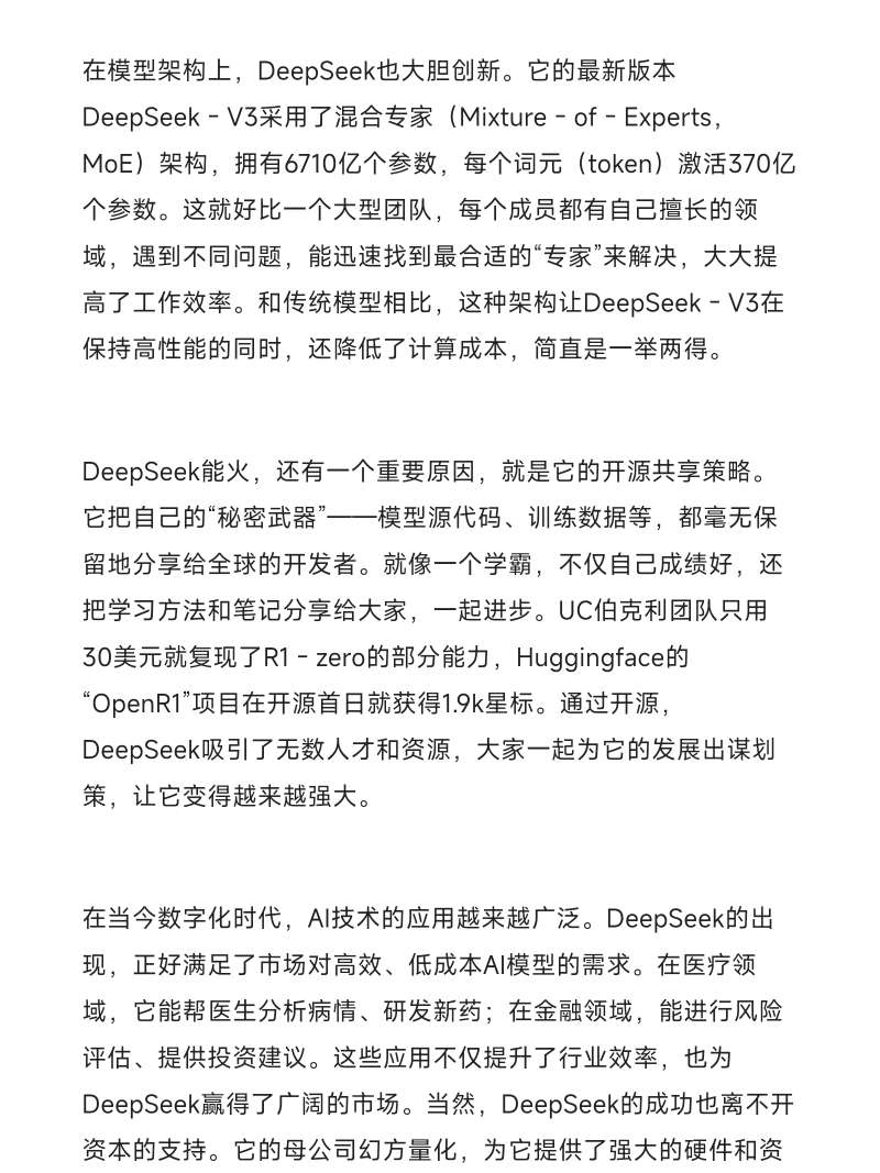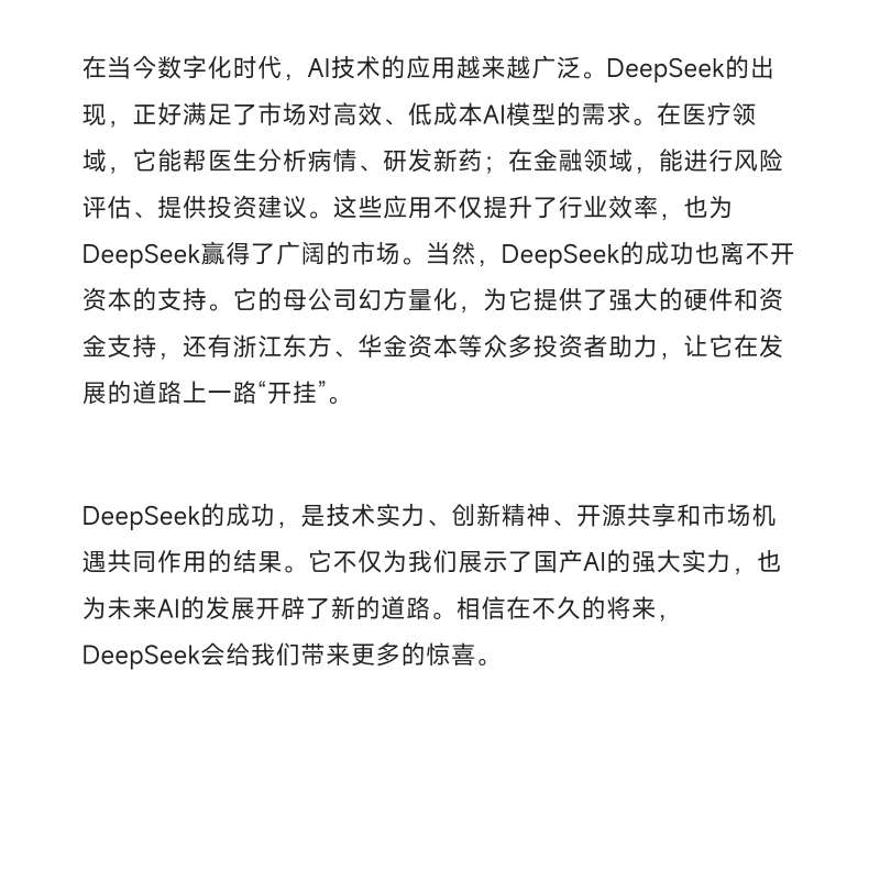 在当今数字化时代,AI技术的应用越来越广泛。DeepSeek的出现,正好满足了市场对高效、低成本AI模型的需求。在医疗领域,它能帮医生分析病情、研发新药;在金融领域,能进行风险评估、提供投资建议。这些应用不仅提升了行业效率,也为DeepSeek赢得了广阔的市场。当然,DeepSeek的成功也离不开资本的支持。它的母公司幻方量化,为它提供了强大的硬件和资金支持,还有浙江东方、华金资本等众多投资者助力,让它在发展的道路上一路“开挂”。