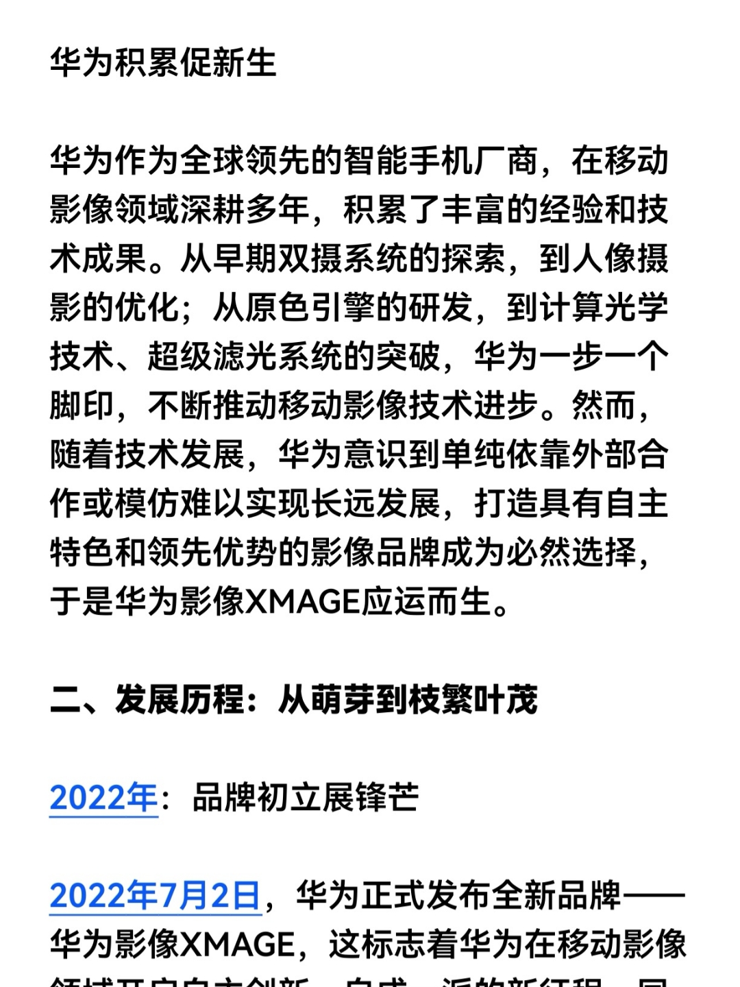 华为作为全球领先的智能手机厂商,在移动影像领域深耕多年,积累了丰富的经验和技术成果。从早期双摄系统的探索,到人像摄影的优化;从原色引擎的研发,到计算光学技术、超级滤光系统的突破,华为一步一个脚印,不断推动移动影像技术进步。然而,随着技术发展,华为意识到单纯依靠外部合作或模仿难以实现长远发展,打造具有自主特色和领先优势的影像品牌成为必然选择,于是华为影像XMAGE应运而生。
