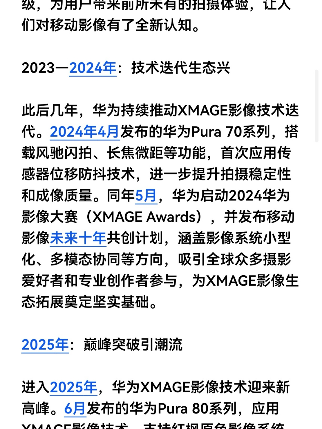 此后几年,华为持续推动XMAGE影像技术迭代。2024年4月发布的华为Pura 70系列,搭载风驰闪拍、长焦微距等功能,首次应用传感器位移防抖技术,进一步提升拍摄稳定性和成像质量。同年5月,华为启动2024华为影像大赛(XMAGE Awards),并发布移动影像未来十年共创计划,涵盖影像系统小型化、多模态协同等方向,吸引全球众多摄影爱好者和专业创作者参与,为XMAGE影像生态拓展奠定坚实基础。