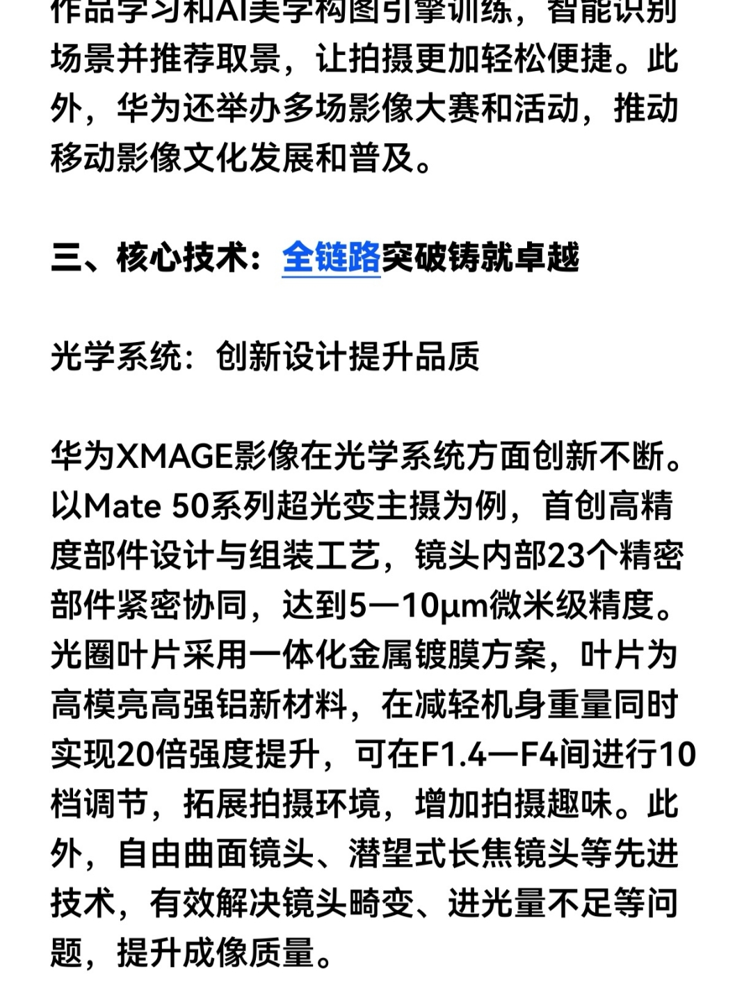 华为XMAGE影像在光学系统方面创新不断。以Mate 50系列超光变主摄为例,首创高精度部件设计与组装工艺,镜头内部23个精密部件紧密协同,达到5—10μm微米级精度。光圈叶片采用一体化金属镀膜方案,叶片为高模亮高强铝新材料,在减轻机身重量同时实现20倍强度提升,可在F1.4—F4间进行10档调节,拓展拍摄环境,增加拍摄趣味。此外,自由曲面镜头、潜望式长焦镜头等先进技术,有效解决镜头畸变、进光量不足等问题,提升成像质量。
