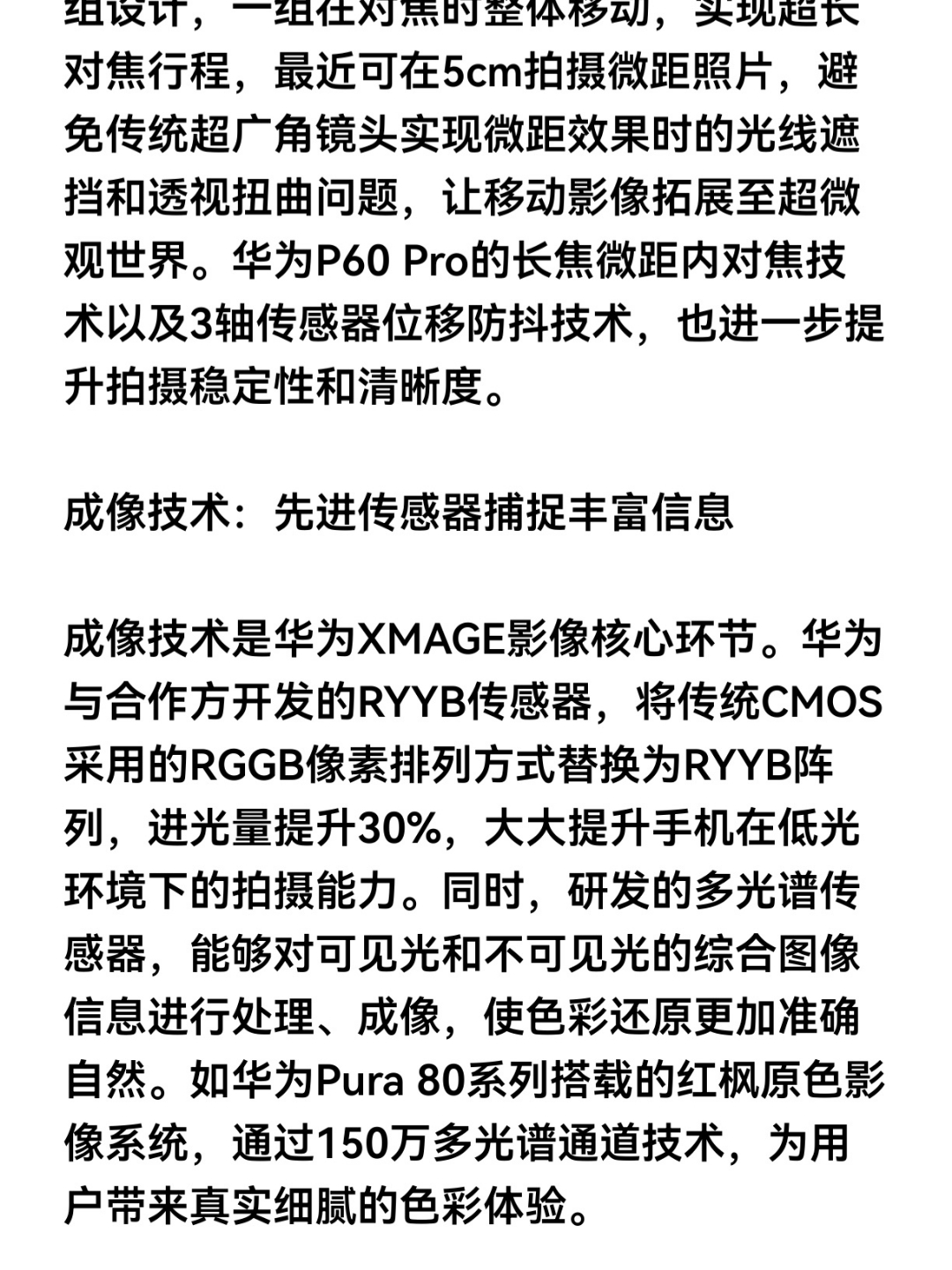 机械结构上,华为XMAGE影像同样成果显著。Mate 50 RS保时捷设计款的超微距长焦摄像头,采用超长行程滑轴式马达,实现35倍数字变焦超级微距拍摄。其内部两个镜片组设计,一组在对焦时整体移动,实现超长对焦行程,最近可在5cm拍摄微距照片,避免传统超广角镜头实现微距效果时的光线遮挡和透视扭曲问题,让移动影像拓展至超微观世界。华为P60 Pro的长焦微距内对焦技术以及3轴传感器位移防抖技术,也进一步提升拍摄稳定性和清晰度。