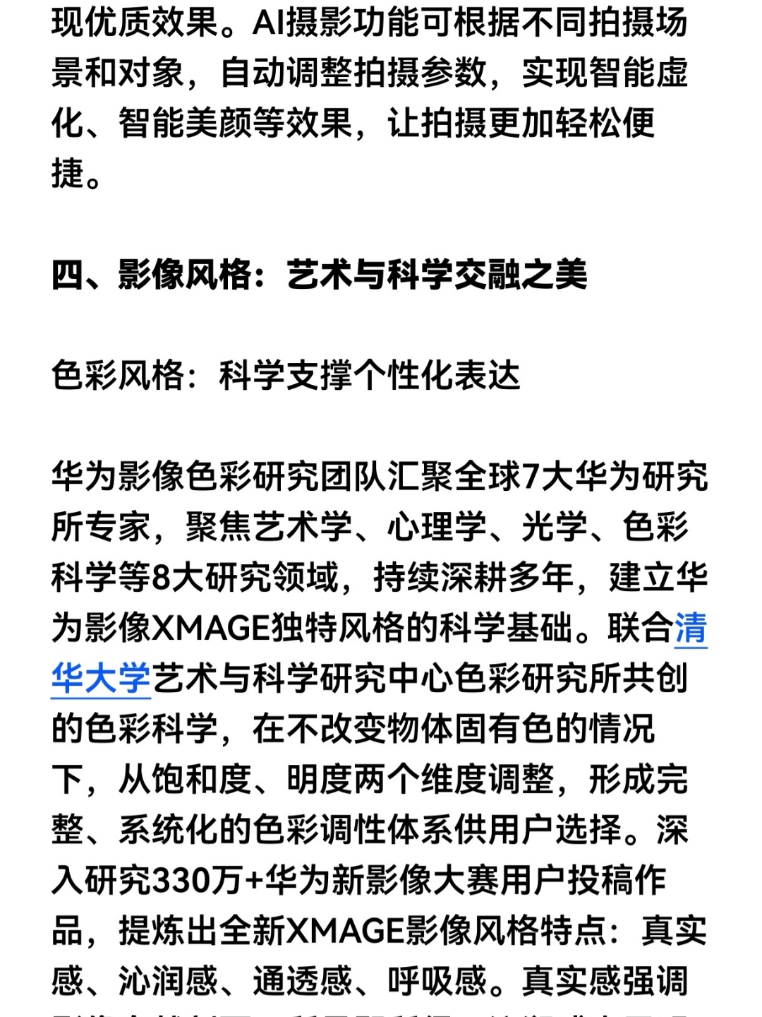 华为影像色彩研究团队汇聚全球7大华为研究所专家,聚焦艺术学、心理学、光学、色彩科学等8大研究领域,持续深耕多年,建立华为影像XMAGE独特风格的科学基础。联合清华大学艺术与科学研究中心色彩研究所共创的色彩科学,在不改变物体固有色的情况下,从饱和度、明度两个维度调整,形成完整、系统化的色彩调性体系供用户选择。深入研究330万+华为新影像大赛用户投稿作品,提炼出全新XMAGE影像风格特点:真实感、沁润感、通透感、呼吸感。真实感强调影像自然刻画,所见即所得;沁润感忠于明暗,强化光感;通透感意指细节清晰,层次分明;呼吸感则是主体突出,虚实有度。