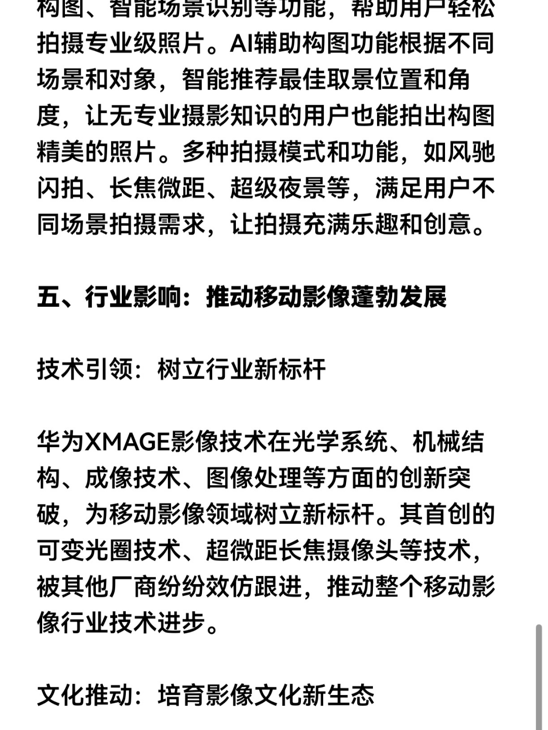 华为XMAGE影像技术在光学系统、机械结构、成像技术、图像处理等方面的创新突破,为移动影像领域树立新标杆。其首创的可变光圈技术、超微距长焦摄像头等技术,被其他厂商纷纷效仿跟进,推动整个移动影像行业技术进步。